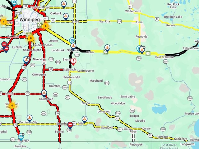 The list of highways closed due to snow and blowing snow continues to grow. Whiteout or near whiteout conditions have been reported by multiple drivers across Southeastern Manitoba as a gusty northwest wind howls across the prairies. Highway 59 has now been closed from Winnipeg to the US border as well has Highway 52 west Steinbach and PR 23 from the 59 to Morris. Highway 75 is now also closed all the way from Winnipeg to the US border as is the Perimeter Highway along with many highways west and north of Winnipeg. Related Stories: Friday travels impacted by blowing snow, advisory continues Hazardous travel expected Friday as blowing snow moves into southern Manitoba Driving on a closed highway could cost you hundreds in fines Environment Canada is calling for wind gusts as high as 80 kilometres per hour early in the afternoon, diminishing to 60 kilometres per hour later on. As of noon, readings at the Kleefeld weather station show gusts between 50 and 70 kilometres per hour. To check the road conditions map for yourself, visit the Space Age Kal Tire Road Reports and Cancellations Page.
